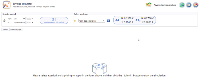 The Savings Calculator is a tool to evaluate the savings that could be achieved bu applying a specific printing policy.. Available since the Watchdoc 5.3 version (Savings estimator), this tool has been redesigned to offer a simplified consultation of the savings that can be achieved.