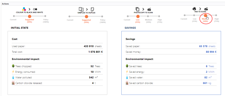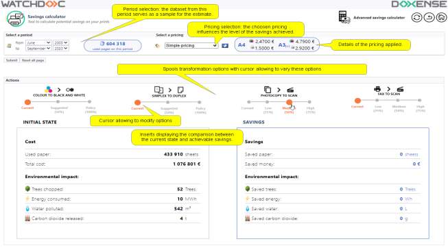 To estimate the savings, change the print settings using of the cursor. For all these parameters, the cursor is initially placed on the milestone Current, as print activity is set up in Watchdoc :