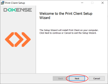 In the Print Client Setup dialog box, click on Next to continue the installation;