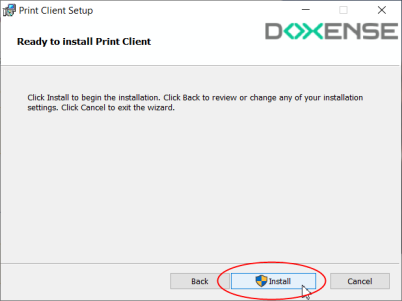 In the Ready to install Print Client, dialog box, click on Install to launch installation: