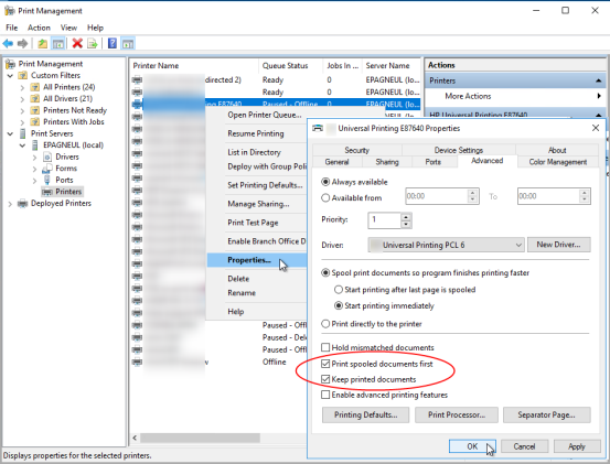 then click on the device properties window, under the Advanced tab, check the Keep printed documents box and then, click the OK button to apply the archiving of the print-jobs generated by this device: