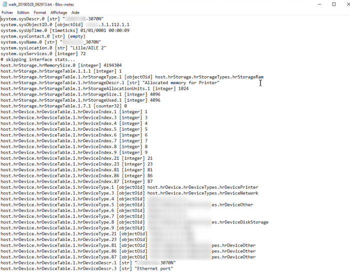 This tool, which creates a point capture of the device's SNMP tree, can be used at regular intervals, before or after a printout, to allow a comparative study of the different data in the device.