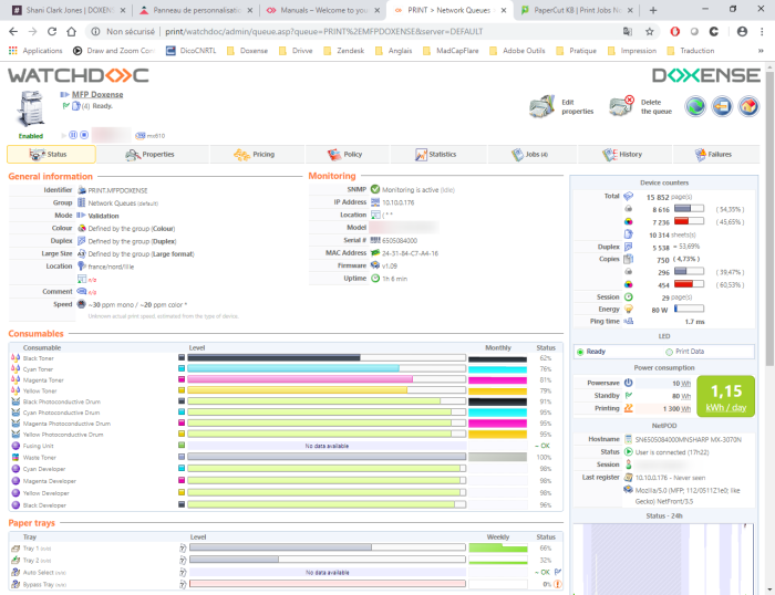 in the Status tab, see the information about the devices counters, about pending alerts and about printing consumables levels;