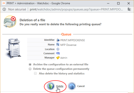In the confirmation box that is displayed, specify if you want to archive the configuration or if you want to delete it permanently;