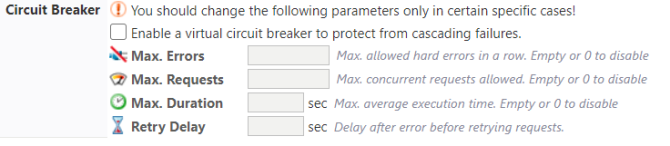 Retry Delay: after starting the circuit breaker, waiting time before reactivation. At the end of this delay, Watchdoc restarts the requests in order to "probe" the state of the server. If the requests are successful, the fuse is reactivated, otherwise it waits for the timeout to expire again.