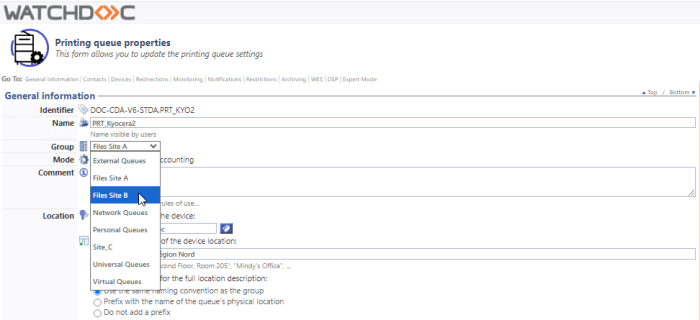 For example, if you have a fleet of print devices divided between Site A and Site B, managing rights to groups of queues means that operators at Site A do not have access to the management of queues at Site B (and vice versa). That facilitates the day-to-day management of the queues for which they are responsible.
