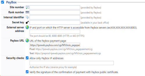 Allow only Paybox IP addresses: check the box to limit the payment confirmation to PayBox addresses only. Uncheck the box if the payment confirmation uses an other system and enter the IP of this system if necessary (reverse proxy IP, for example);