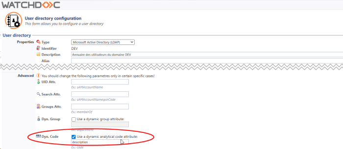 on the User Directory Configuration page, in the Advanced section, for the Dyn. Code parameter: