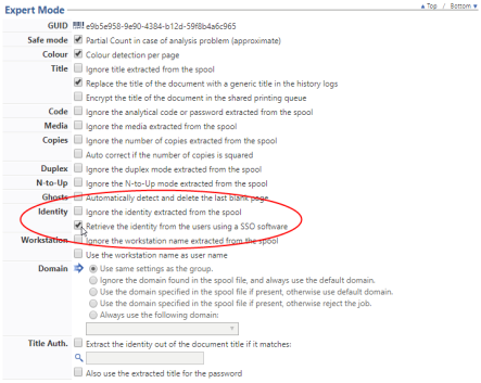 in the Printing queue properties interface, Expert Mode section, Identity setting, tick the box Retrieve the identity extracted from the spool;