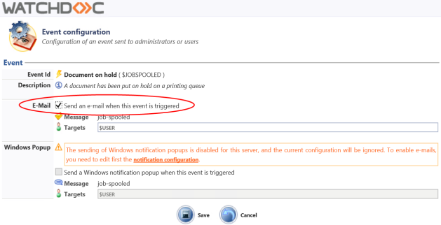 in the "Print Job Events" > "Document Pending" section if you want the email to be sent each time the user initiates a print;