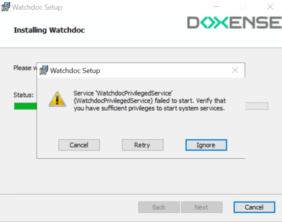 During the installation of Watchdoc 5.4.1.4179 or 5.5 if you ask to activate the Privileged services (necessary to activate the WeScan function), an error message indicates "Service WatchdocPrivilegedService failed to start" and the installation fails, whatever the option chosen to continue (cancel, retry or ignore):