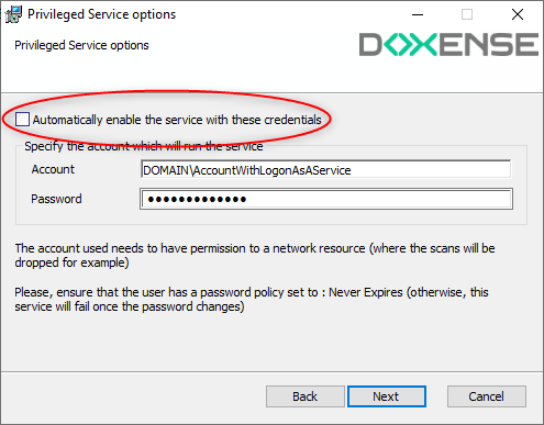 To get around this problem, you should install Watchdoc WITHOUT enabling the service with the Privileged service credentials and then activate the Privileged service later, once Watchdoc is correctly installed.
