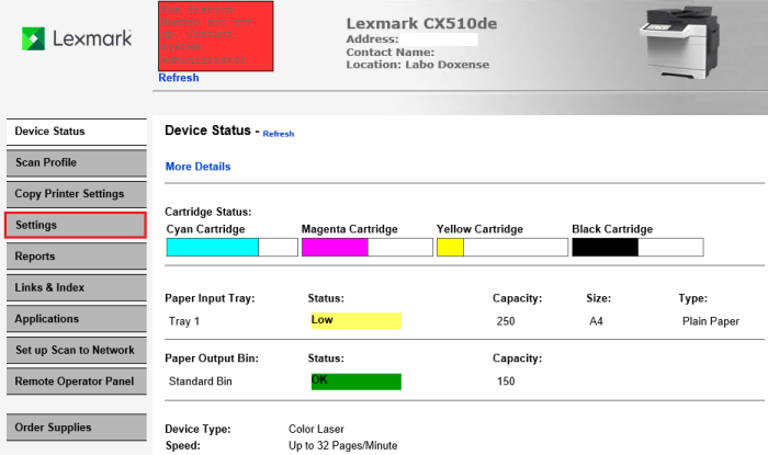 2. On the Lexmark device administration page, click the Settings menu entry:
