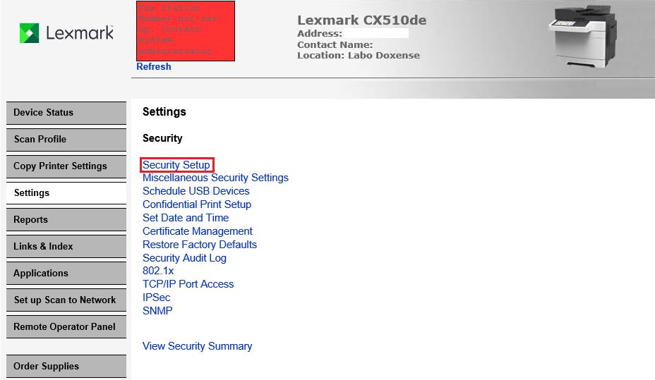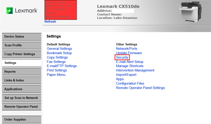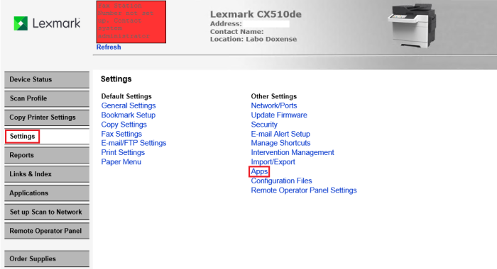 1. Access the Lexmark device's administration web interface (by entering its IP address in a web browser);