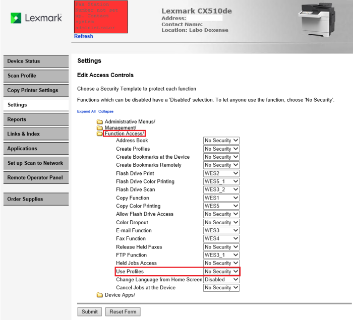 6. Expand the folder Function Access. Go to the drop-down list Use Profiles and make sure the value No Security is selected :