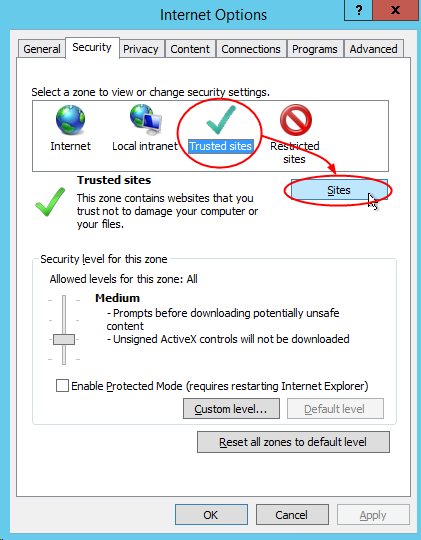 in Internet Explorer, access the Security tab: Tools > Internet options > Security Tab;