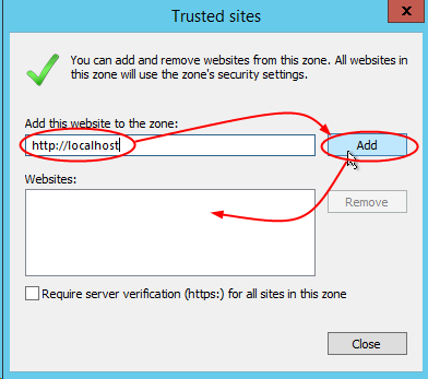 When the http://localhost address is displayed in the Web Sites field, click on the Close button.