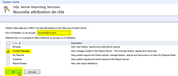 tick the Content Manager role, then validate by clicking on the OK button;