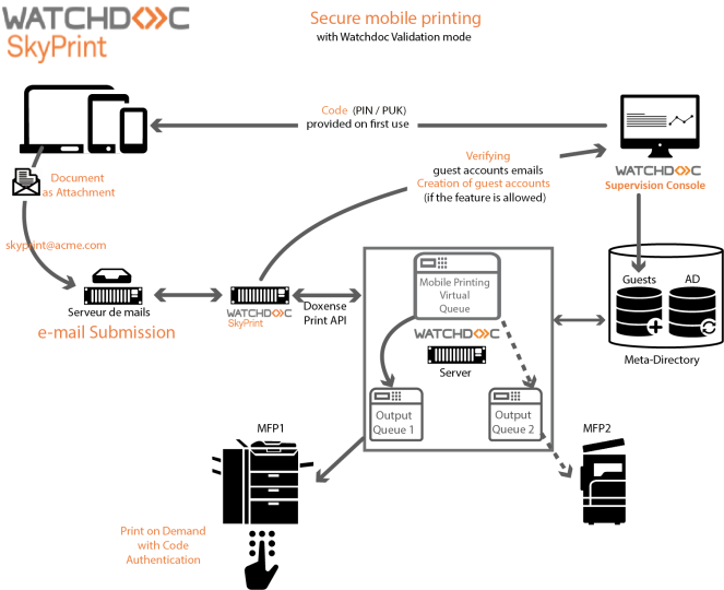 When Watchdoc operates in ‘validation’ mode, printing is secure: print jobs are blocked in the device and users must unlock their prints after being identified. To do this, they need a code (PUK/PIN).