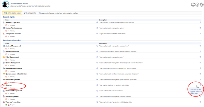This configuration requires a user account (login/password) with Skyprint administrator privileges. This access right must therefore be configured in Watchdoc beforehand.