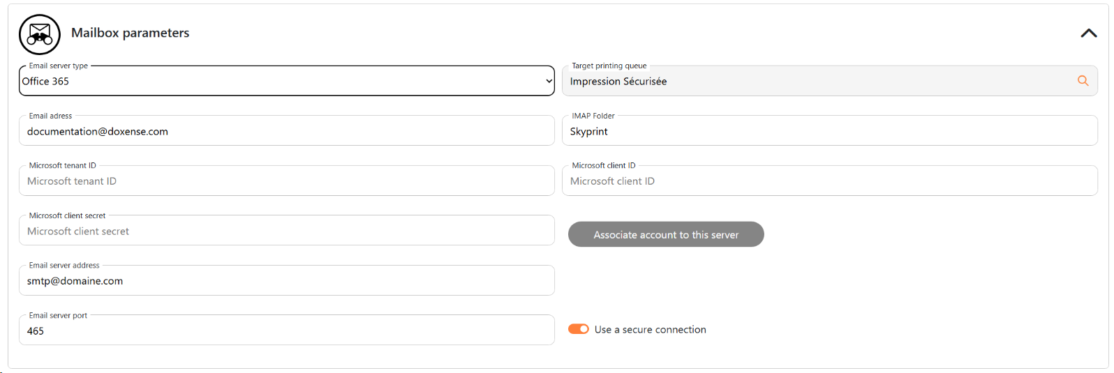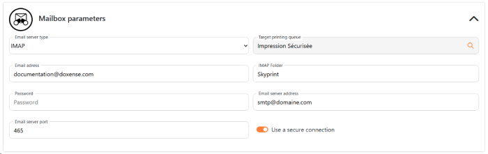 IMAP folder: if necessary, specify a folder in the mailbox where print requests are saved. This setting allows you to group print requests intended for Skyprint if the mailbox is not dedicated solely to this purpose :