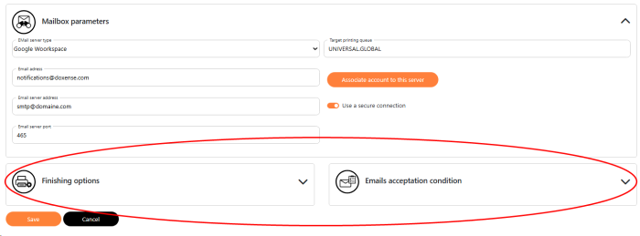 However, you can configure specific finishing options and acceptance conditions for the mailbox you are configuring. In this case, in the Edit a Mailbox interface, complete the following if necessary: