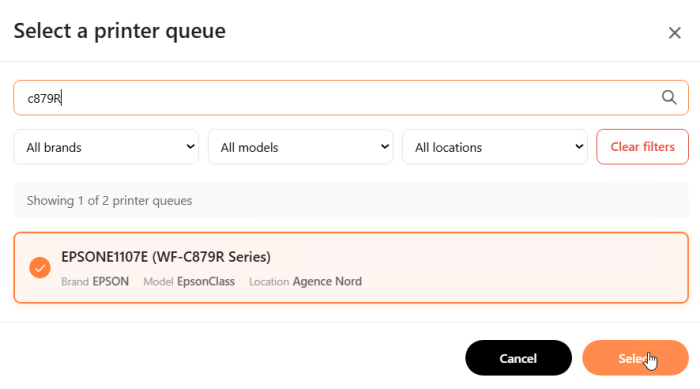 in the field, enter a search criterion to find the print queue (model, brand, item entered in the queue properties);