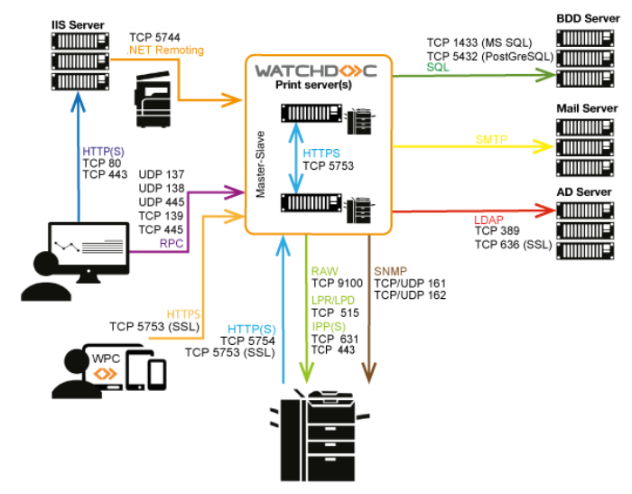 | Watchdoc Service (core print server) | TCP 9100 TCP 515 TCP 631 or TCP 443 |