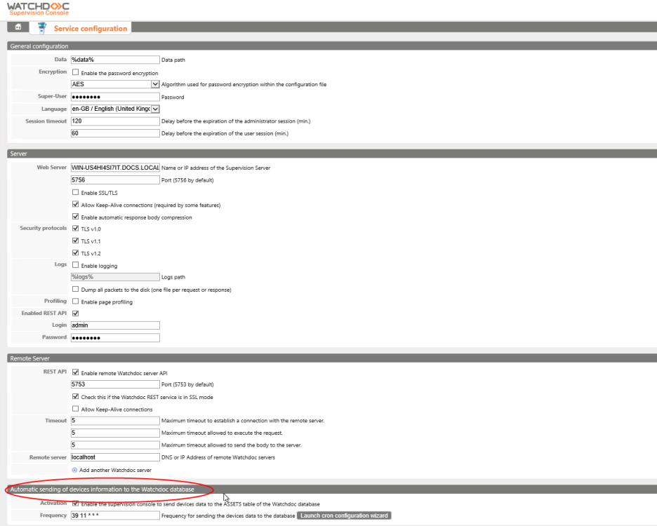In the Service Configuration interface> Automatic sending of devices information to the Watchdoc database section,