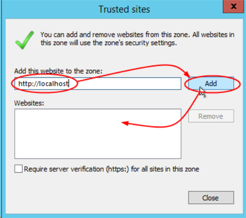 When the http://localhost address is displayed in the Web Sites field, click on the close button.