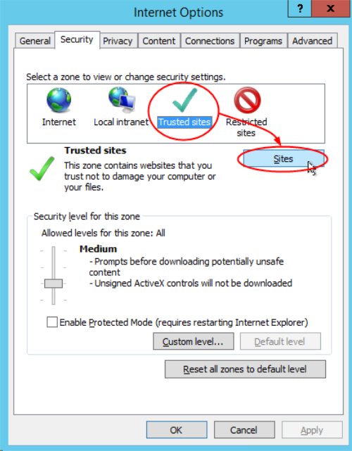 in Internet Explorer, access the Security tab: Tools > Internet options> Security Tab;