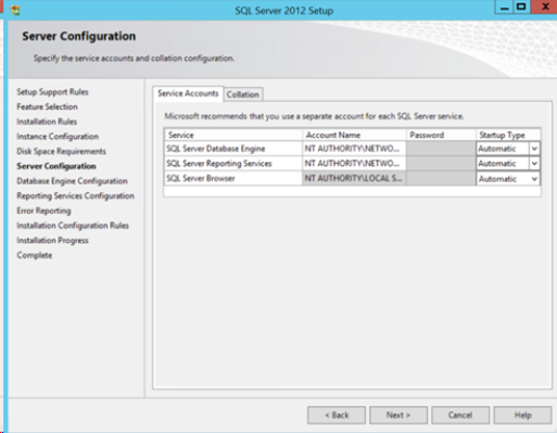 in the Server Configuration box, in the Account Name column, keep the default value (network service):