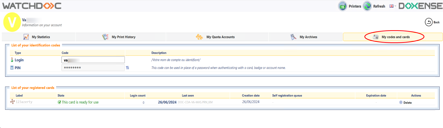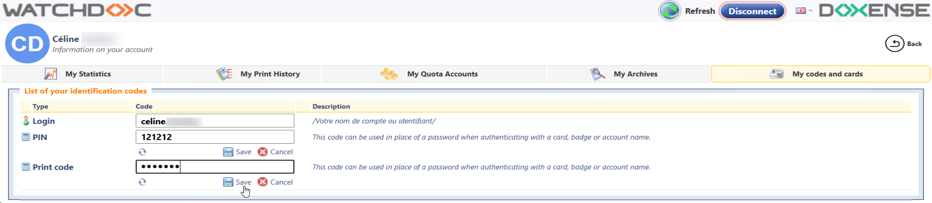 The list Your identification codes contains more or less codes (PIN, PUK, print code) depending on the configuration applied. If the code is hidden, click on the View