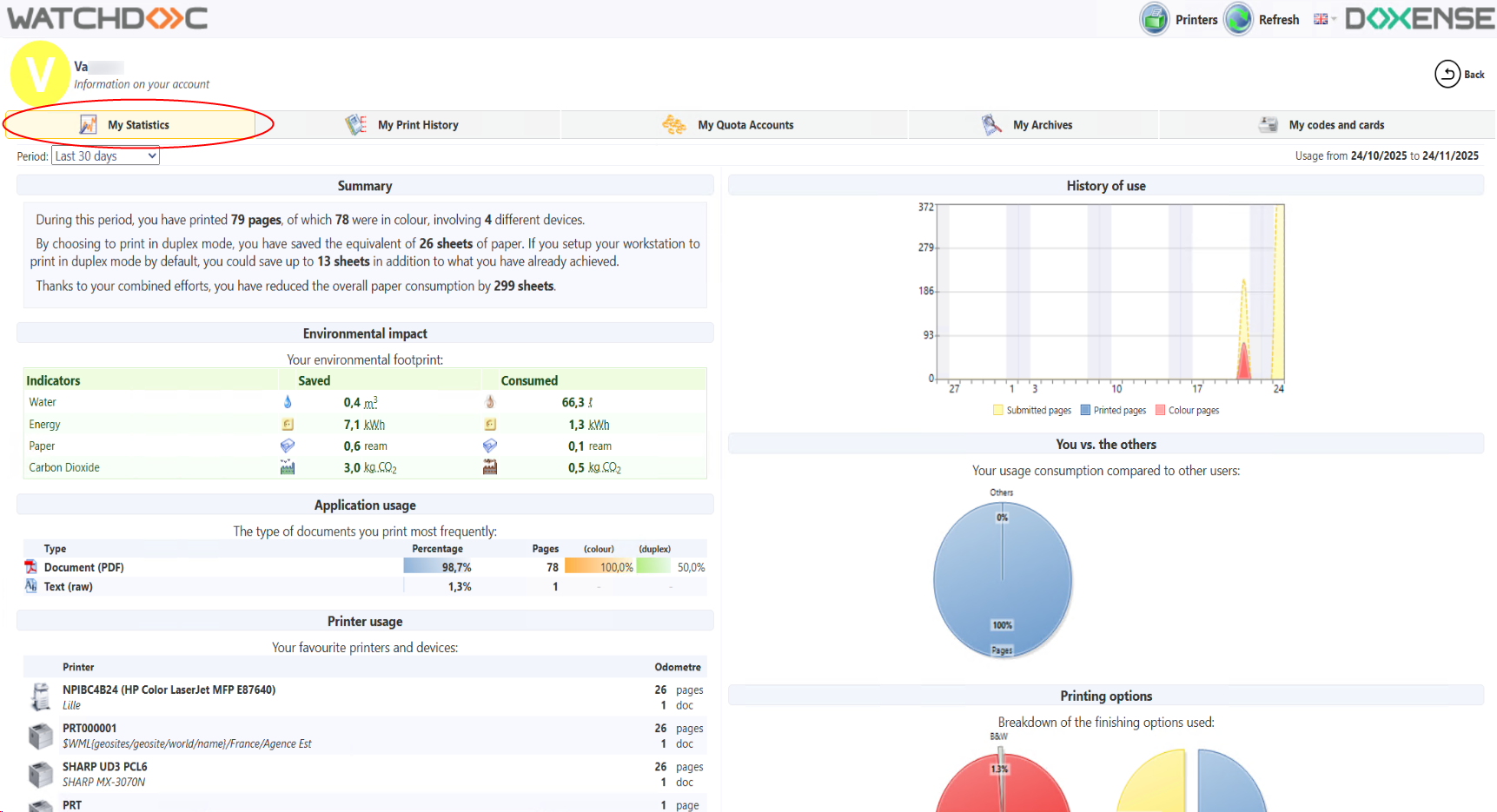 click on the My Statistics tab: you will be taken to an interface that displays your Watchdoc usage data and the resulting environmental impact:
