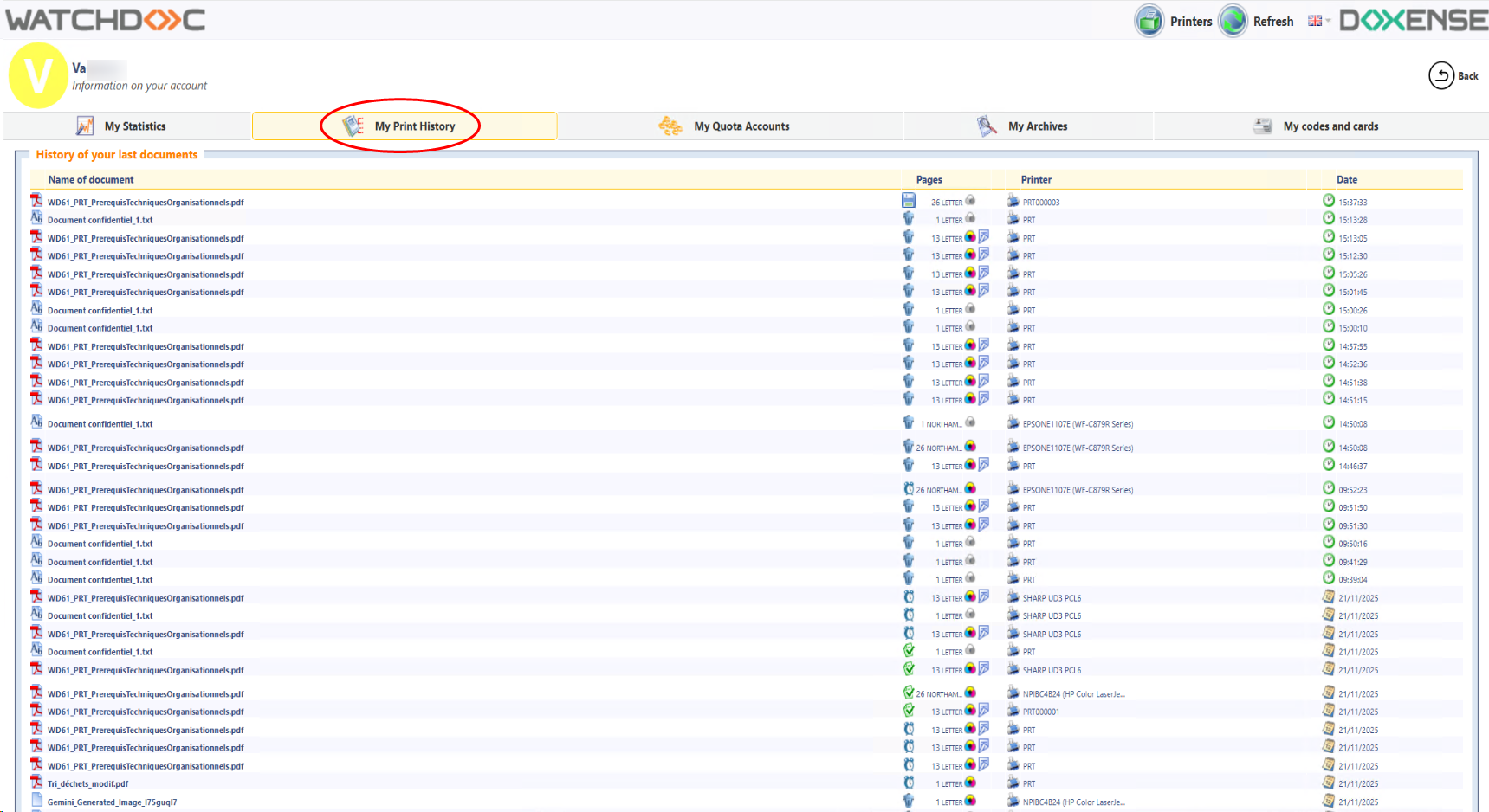 from the WES (Watchdoc interface embedded in the printer screen);