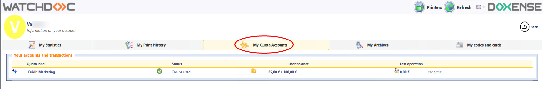 The ‘My Account’ page is Watchdoc's web interface dedicated to user access. As it offers the same features as a WES (Watchdoc interface embedded in the printer screen), it may not be offered by the administrator. Furthermore, depending on how the administrator has configured it, it may offer a variety of uses. It may therefore allow you to:
