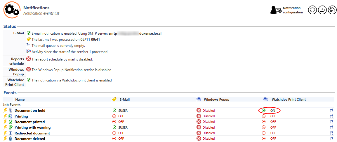 - In the list of events, check that ON is displayed in the Watchdoc Print Client column corresponding to the configured event: