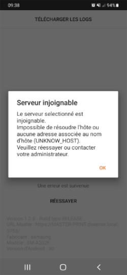 If the application cannot contact the server (WI-FI connection disabled or server unavailable), an error message is displayed: