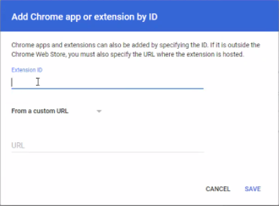 In Add the Chrome app or extension by ID interface, enter either the extension identifier in the Extension ID field, or its URL in the From a custom URL field, then click