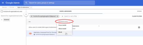 Block : select this mode to block the usage of this extension on the Chromebook® workstations or Chrome® browsers managed by your organization :