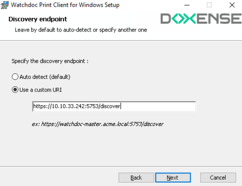 under GPO, the command line is: msiexec /i "WatchdocPrintClient-%VERSION%.msi" /qn /norestart DISCOVER_URI_MODE=1 DISCOVER_CUSTOM_URI="https://server:port/discover"