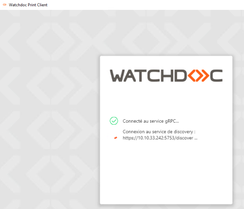 → Watchdoc Print Client Windows is launched and attempts to connect to the discovery service without success. The configuration should be continued in the Watchdoc administration interface: