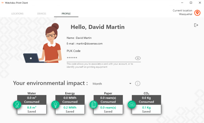 In tab Profile, users can check their informations, get their print code (PUK code) et view their environmental impact.