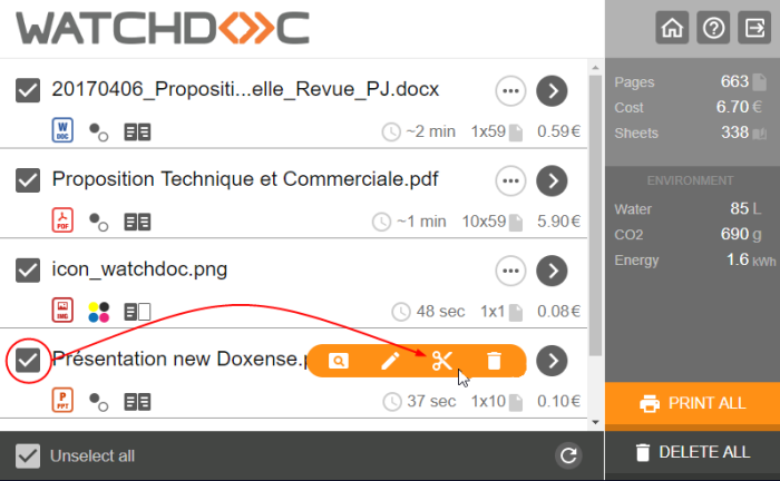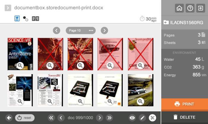 To delete, users click on the pages they do not wish to print.The deleted pages are crossed out in red: they can then click on Print to print only the pages they want: