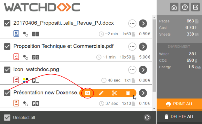 It is possible to obtain more information about a job by clicking on the icon at the beginning of the line (document type) and then using the zoom tool :