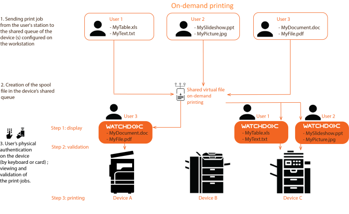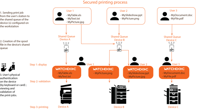This mode allows to hold all print jobs in the shared print queue which is configured on the user's computer. The user can release his print-job only on this device after authentication.