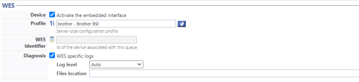 WES identifier subsection: Once you have ticked the box and selected the profile, the ID of the WES field will fill itself with “$AUTOSERIAL$”. Keep it that way so that the server will determine itself the serial number of the device and use it as the WES ID. You can also input directly the serial number of the device in this field.