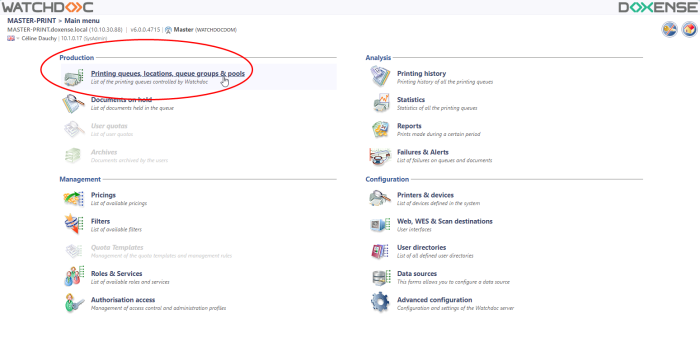 From the Main Menu of the Watchdoc administration interface, in the Production section, click Print Queues, Queue Groups & Pools: