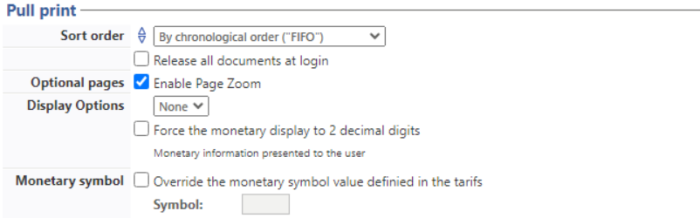 In this section, you can change options about the Watchdoc release application: sort order of the document, tariff information and optional pages.