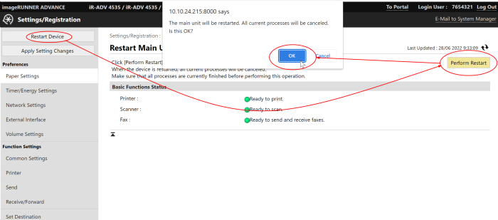 Confirm twice that you want to restart the device (a message will inform you that jobs in progress will be lost).